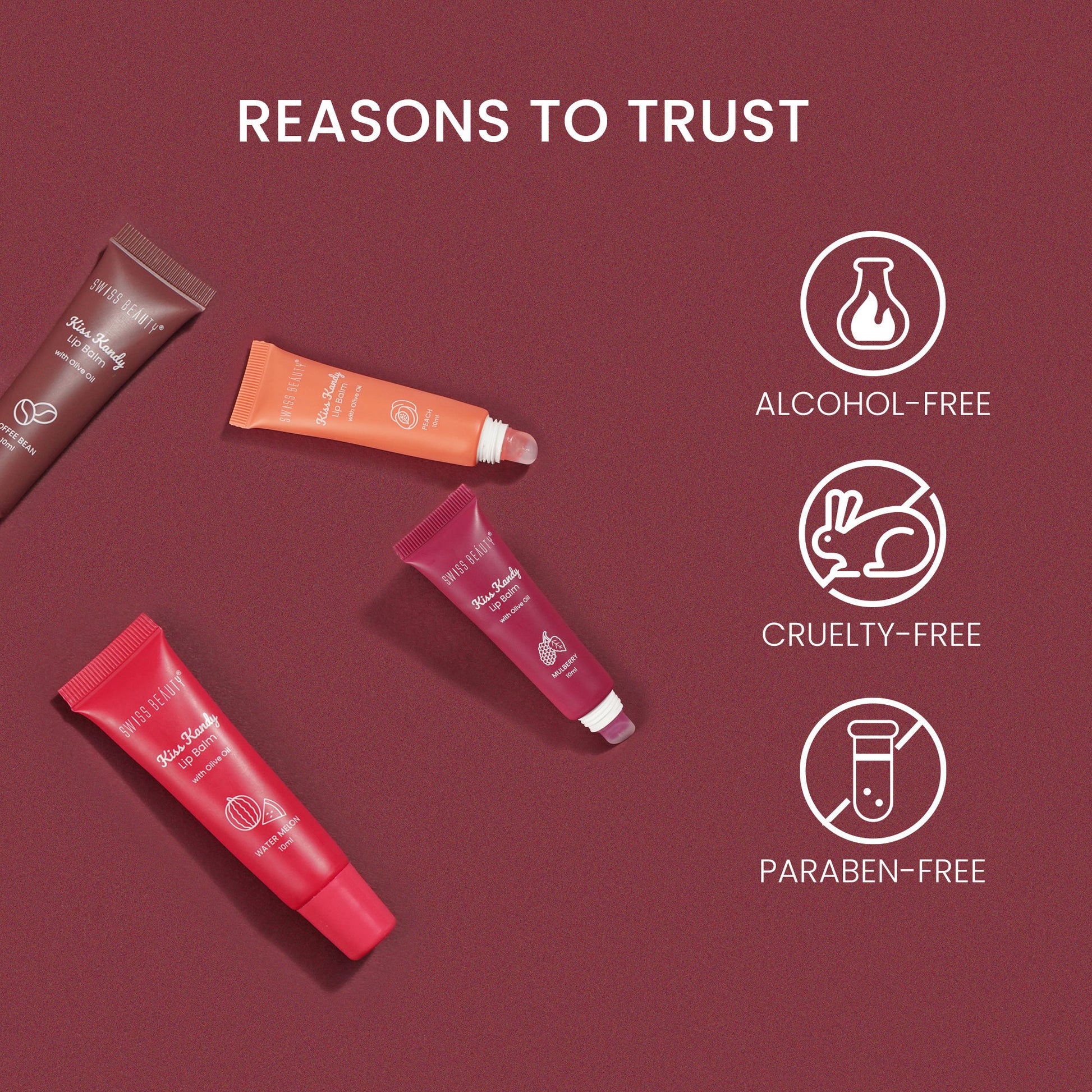 - Gives Translucent Sheen: Go Flaunt that Pout! Swiss Beauty Kiss Kandy Lip Balm gives off a translucent shiny finish upon application. Available in 6 Tinted Fruity Shades: Our Kiss Kandy Lip Balm is available in 6 tinted, fruity shades that give you a fruity punch while keeping your lips nourished. Cruelty-Free, Paraben-Free, Alcohol Free: This moisturising and nourishing Lip Balm by Swiss Beauty is tested to be cruelty free, paraben-free and alcohol-free, making it safe for your lips.
